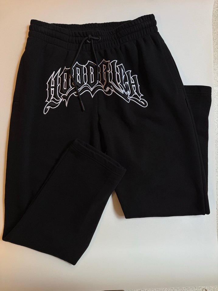 Nakışlı goth yazılı, fermuarlı detaylara sahip siyah oversize eşofman, yumuşak ve sıcak kumaştan günlük rahatlık için. Hoodrich marka