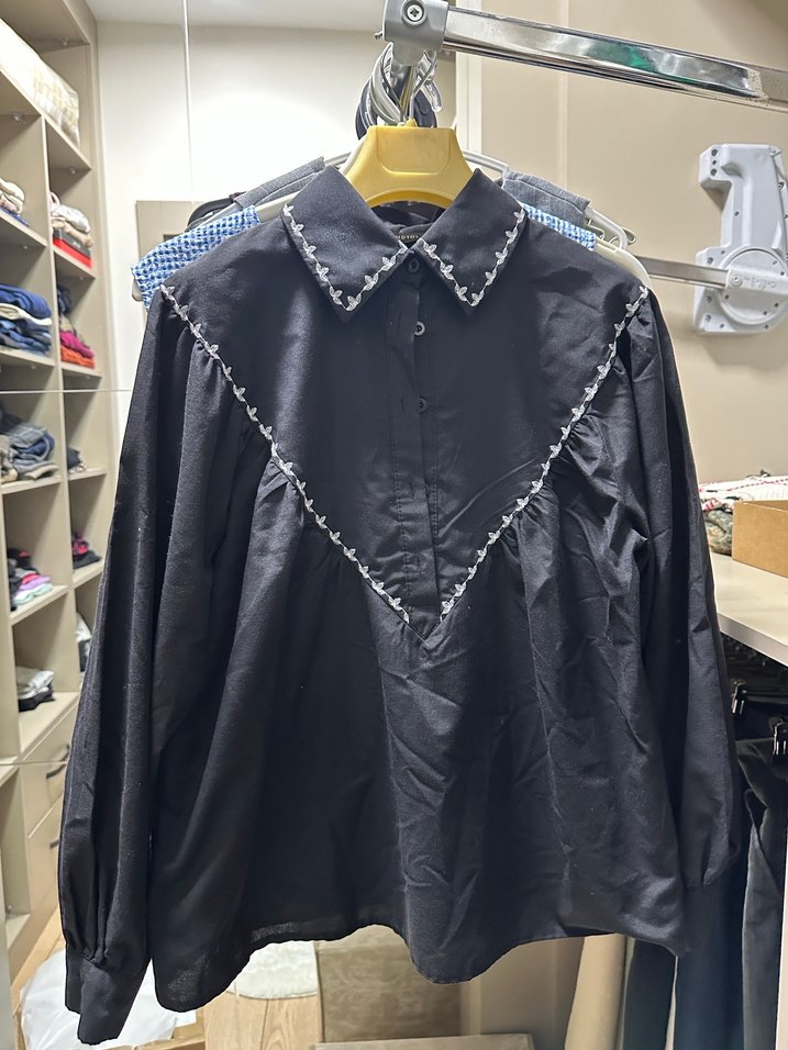 Nakışlı detaylara sahip, düğmeli yakalı siyah uzun kollu gömlek. Salaş kesimi ve rahat kullanımıyla günlük şıklık sağlar.
