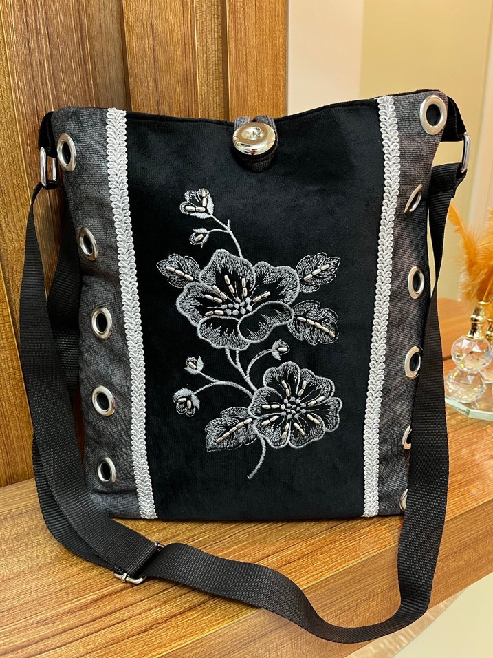 Nakışlı çiçek desenli siyah süet kadın çantası, tokalı detaylıdır. Gri vurgulu bohem tarzda, ayarlanabilir askılıdır.