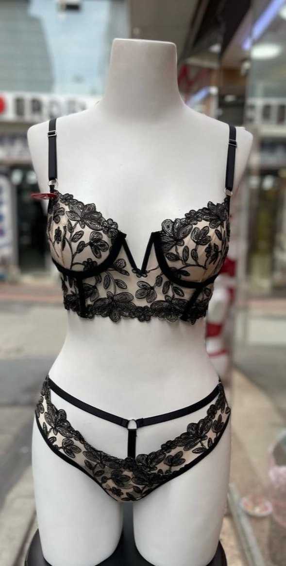 Nakışlı çiçek desenleriyle siyah mini uzunlukta kısa bir büstiyerdir. Ayarlanabilir askıları ve şeffaf kumaş tabanı bulunur. 85 ve 90 bendenleri mevcuttur.