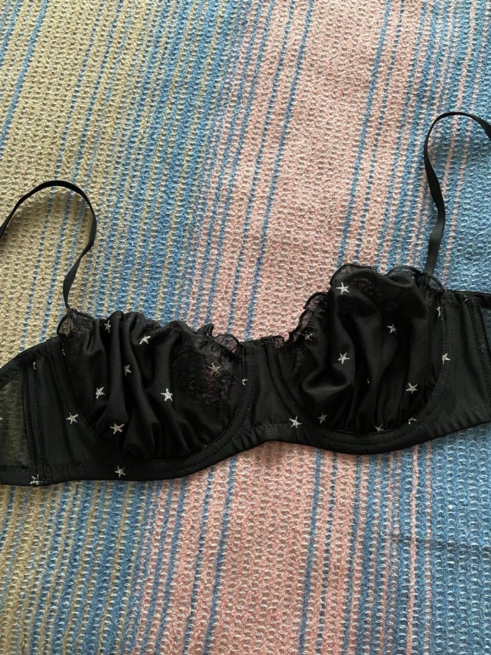 Nakışlı yıldız desenleriyle siyah midi uzunlukta sütyen, Parisli tarzını yansıtıyor. Ayarlanabilir askılı ve zarif bir tasarıma sahip. (HIC GIYILMEDI)