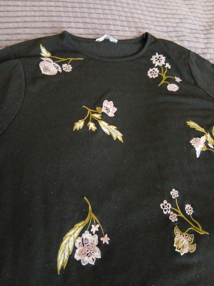 Nakışlı çiçek desenleri, yuvarlak yaka, uzun kollu ve bol kesim siyah hamile tişörtü. Düğmeli detaylı ve midi boyda, rahat günlük kullanım için uygun.