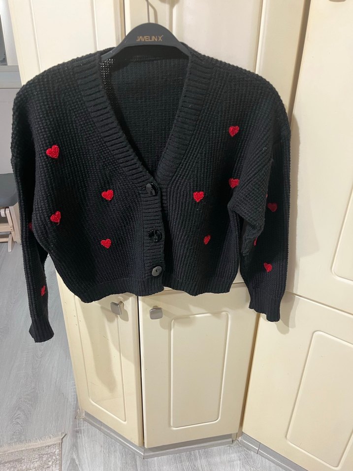 Siyah triko hırka, uzun kollu ve V yaka detaylıdır. Nakışlı kırmızı kalplerle süslenmiş, midi boyda ve bol kesimdir.