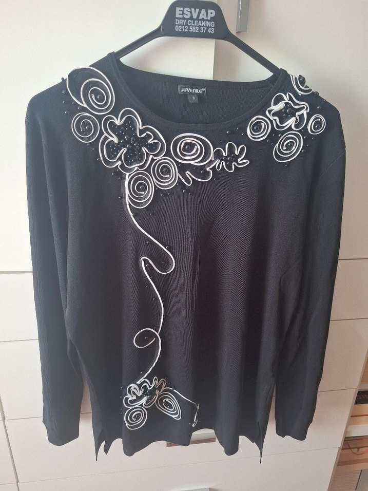 Uzun kollu, bol kesim siyah triko bluz, yakada ve etekte nakışlı avant-garde desenlere sahip. Günlük kullanıma uygundur.