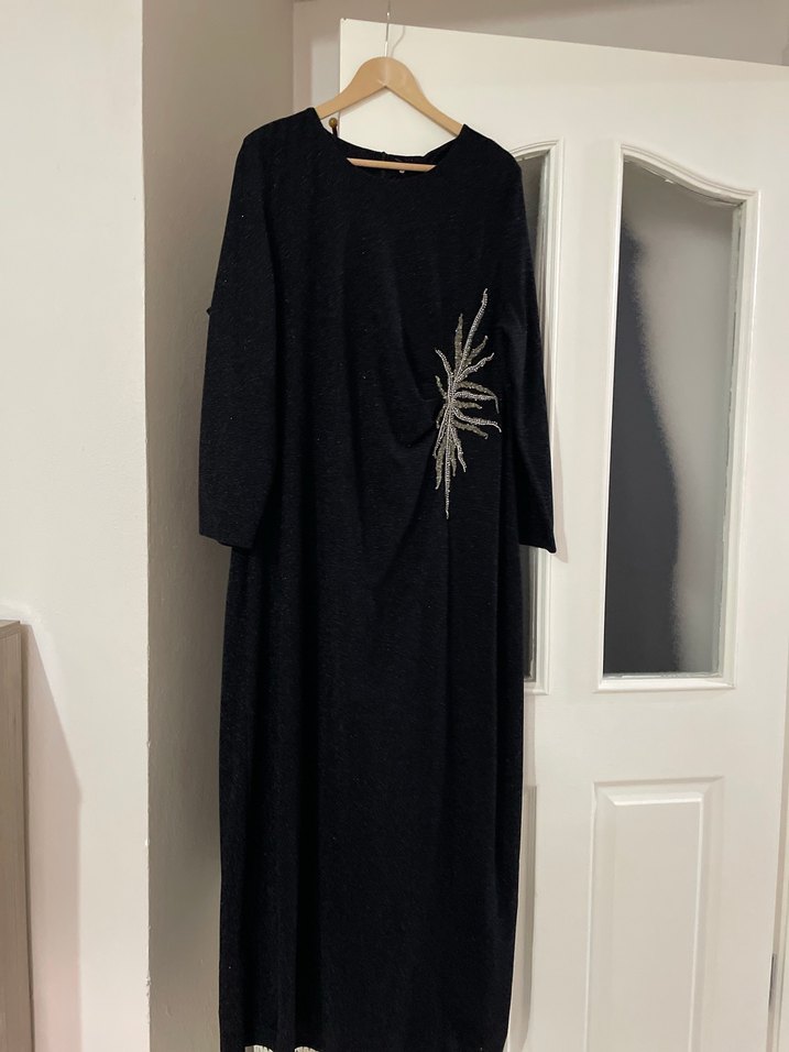 drapeli siyah uzun elbise. Nakışlı detaylar, uzun kollu ve yakası kesik detaylıdır. Sadece 2 kere giyildi temizdir isteyene şalıyla birlikte gönderilcektir 48,50 beden uyumlu