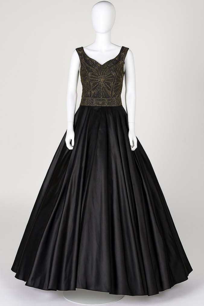 Gold işlemeli üst kısmı, salaş etek ve kolsuz tasarımıyla siyah uzun abiye elbise, düğünler, mezuniyet törenleri için uygundur. Ürün sıfırdır hiç kullanılmadı, hiç tadilat yapılmadı, eteği kısaltılmadı. Hot Contact İstanbul marka. 36-38 beden için uygundur.