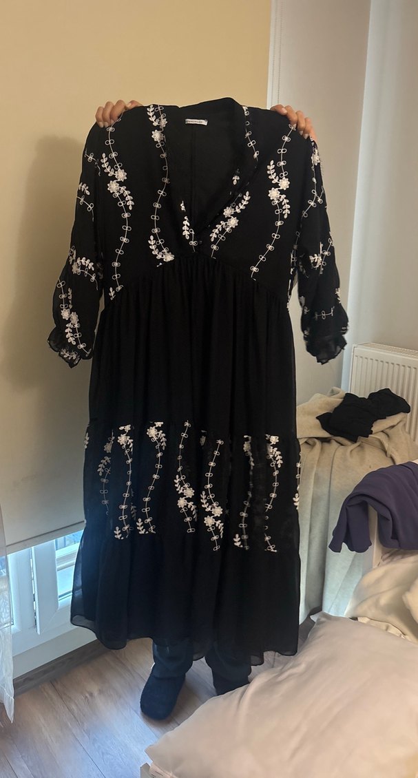 Siyah uzun elbise, beyaz nakışlı çiçek desenleri ve volanlı uzun kollara sahiptir. V yaka ve bol kesim bohem tarzını yansıtır.