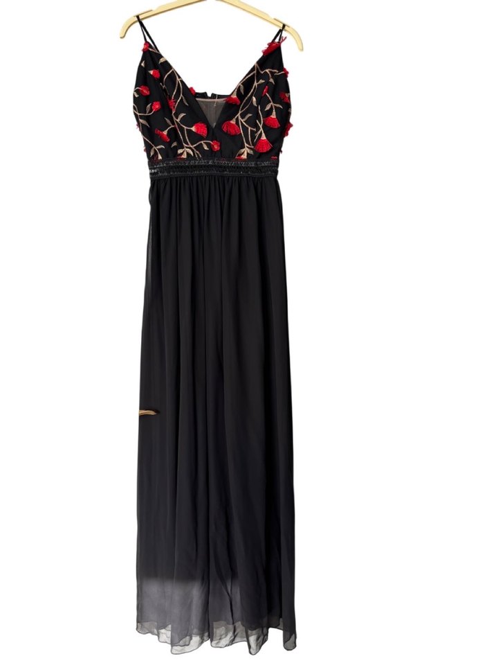 V yaka ve ince askılı, nakışlı detaylarla süslenmiş, dökümlü uzun ve dar kesim siyah elbise. Yumuşak sentetik kumaştan, romantik akşamlar için uygun. 1 kere giyildi ölçüleri Göğüs 78 bel 60