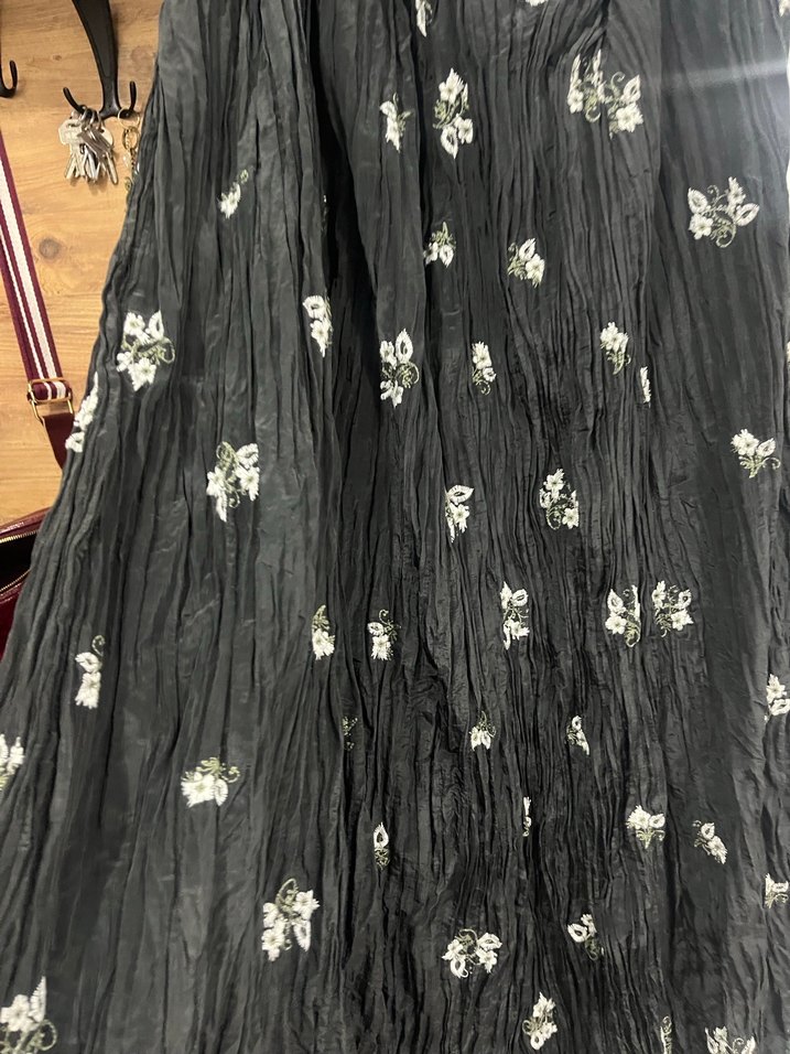Hiçbir sorunu yoktur . Nakışlı çiçek desenleri ve dökümlü, bol kesimiyle siyah uzun tekstil etek. Bohem tarzı, düğün ve retro görünüm için uygundur.