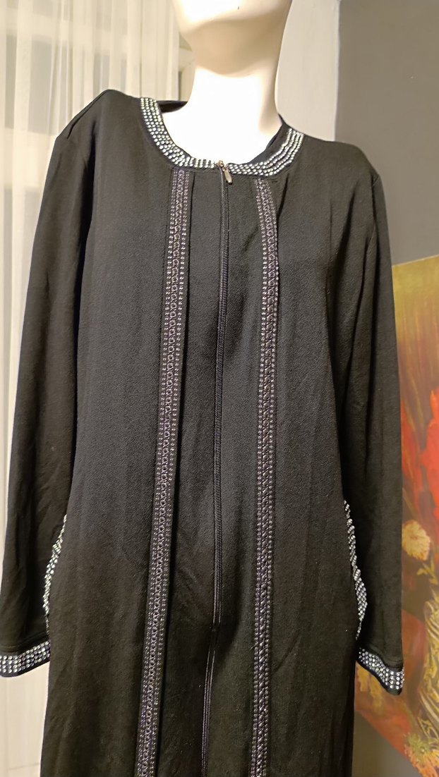 Uzun siyah ceketi, fermuarlı ve nakışlı detaylara sahip. Sentetik kumaştan, uzun kollu ve modest kesimdir, günlük kullanım için uygundur.