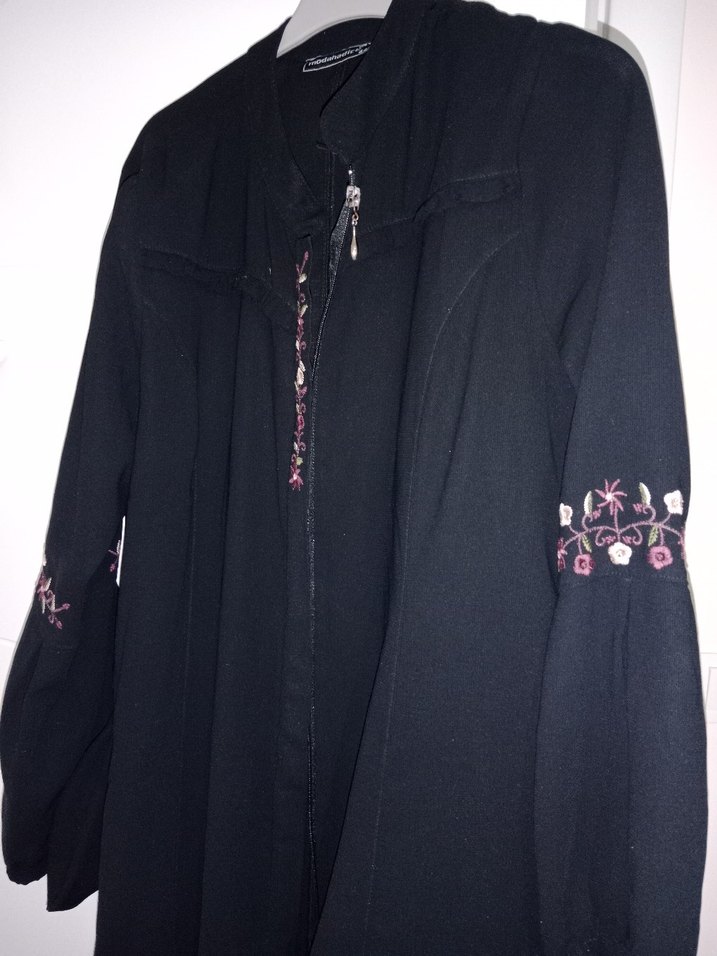 Siyah uzun , kollarında nakış detayları ve çentikli yaka ile tasarlanmıştır. Bol kesim, düğmeli kapama ve uzun kolludur, günlük kullanıma uygundur. kollarındaki lastikler esnefi terzide yapılır hiç kusuru yok yeni gibi 48 bedene kadar olur