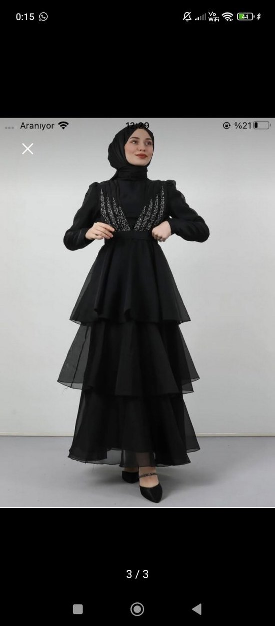 Nakış işlemeli, yüksek yakalı ve askılı kollu siyah uzun abiye elbise. Drapeli ve kat kat kumaşlı, düzenli kesim, düğünler için uygun.