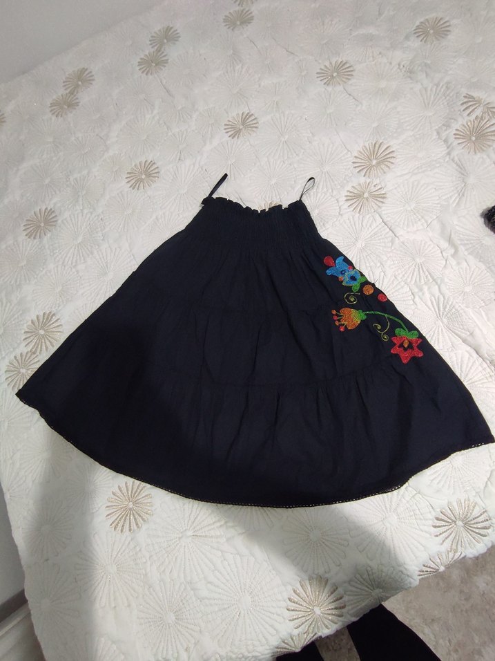 Nakışlı çiçek desenleri ve fırfır detaylarıyla bol kesim siyah hamile eteği, bohem parti stiline uygun.