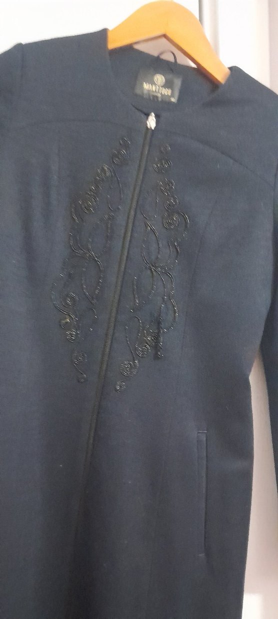 Siyah uzun kaban dar kesim ve yakasında çentikli yaka ile birlikte fermuarlı kapama sunar. Ön kısmında nakış detayları ve uzun kolludur, sentetik kumaştan yapılmıştır kışlık kaşe pardesüdür