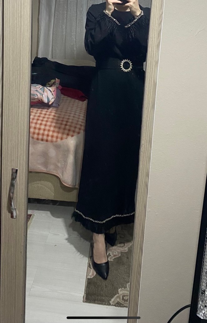 Siyah uzun nakışlı detaylara ve kemere sahip bol kesim. Abiye