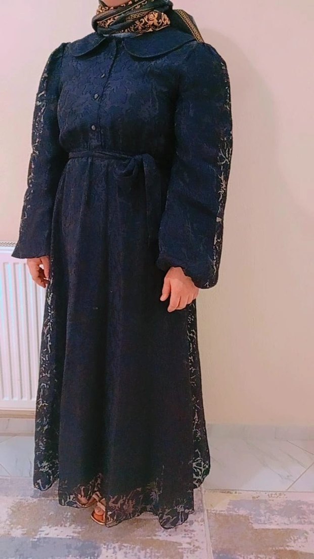 Nakışlı detaylara sahip siyah uzun elbise, notlu yakalı ve uzun kolludur. Sentetik kumaştan, dökümlü ve rahat kesimdir.