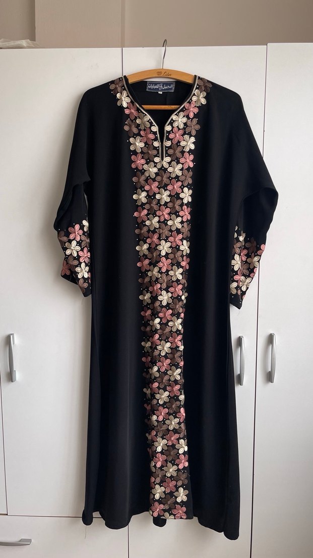 Siyah uzun elbise, bol kesim, uzun kollu ve V yakalıdır. Ortasından ve kollardan renkli çiçek nakışlarıyla süslenmiş, dökümlü yapıya sahiptir. Sentetik kumaştan, mütevazı ve bohem tarzlar için uygundur. 40 - 44 beden uyumludur. Defosu yoktur , ilgilenen arkadaşlara yardımcı olurum .