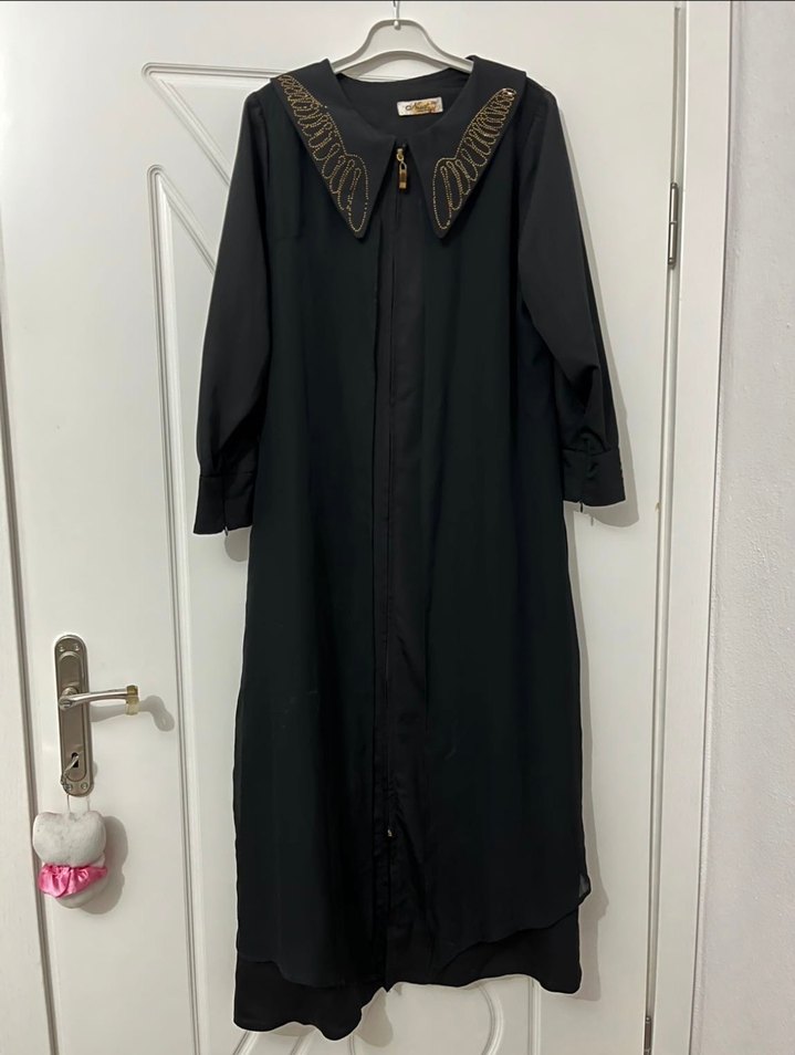 Nakışlı detaylara sahip yakalı siyah uzun ferace, uzun kollu ve dökümlü yapıda. İpeksi kumaştan, günlük kullanıma uygun mütevazı gotik tarzda.