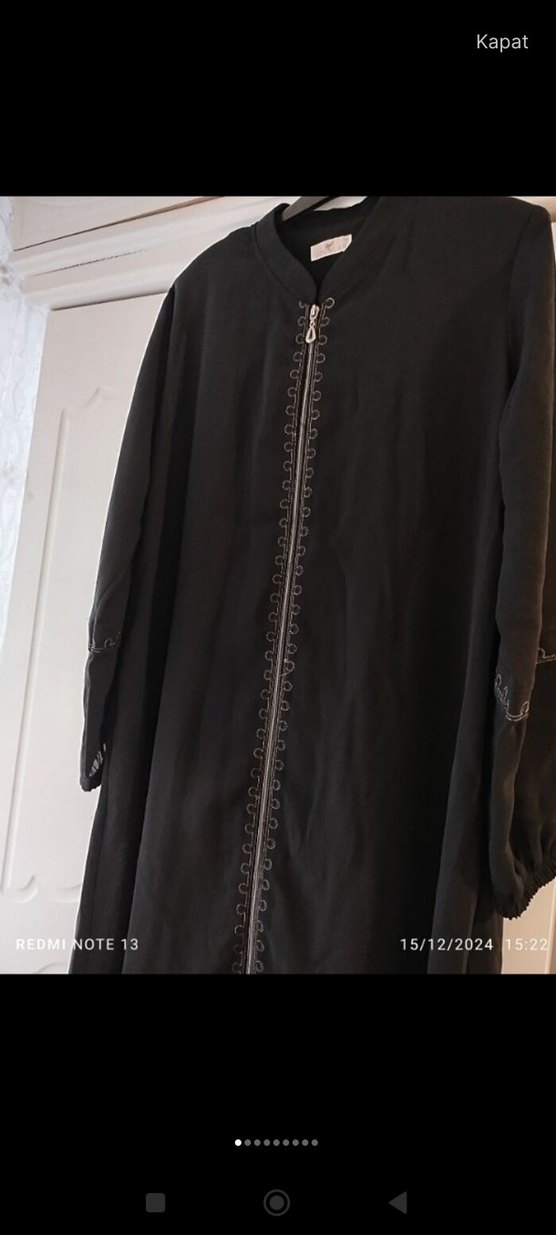 Uzun siyah kadın pardösü, bol kesim, uzun kollu ve kesik yaka detaylıdır. Nakışlı desenleri ve fermuar kapaması ile gotik tarzı yansıtır.