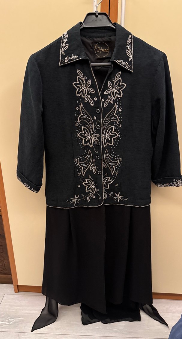 Siyah, uzun ve bol kesim kadın takımı, ipeksi kumaş üzerine işlenmiş çiçek desenlerine sahiptir. Sivri yaka, uzun kollu ve düğmeli ön tasarımıyla klasik şıklık sunar.