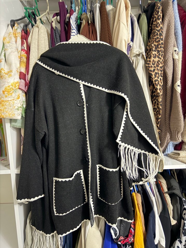 Nakışlı detaylara ve örgülü püsküllere sahip siyah uzun yün kaban. Geniş kesim, kesik yakalı ve uzun kolludur, rahat bohem tarzı için uygundur.