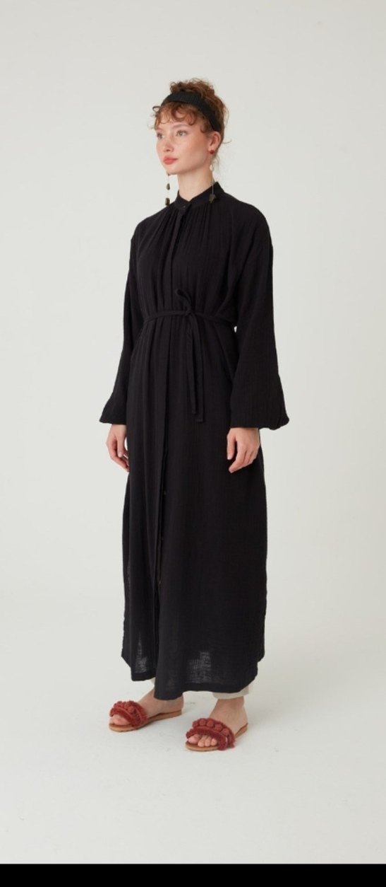 Siyah uzun keten elbise, yüksek yakalı ve uzun kolludur. Nakışlı ve dökümlü tasarımıyla bol ve sade bir kesime sahiptir. sıfır ayarında sadece 1 defa giyildi.