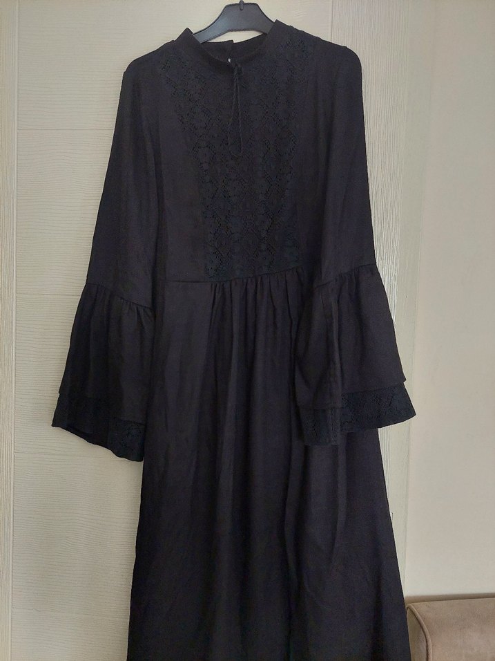 Siyah uzun keten elbise, yüksek yaka ve fırfırlı uzun kollara sahiptir. Nakışlı desenli ve bol kesimdir. Günlük kullanım için uygundur, gotik ve bohem tarzda.