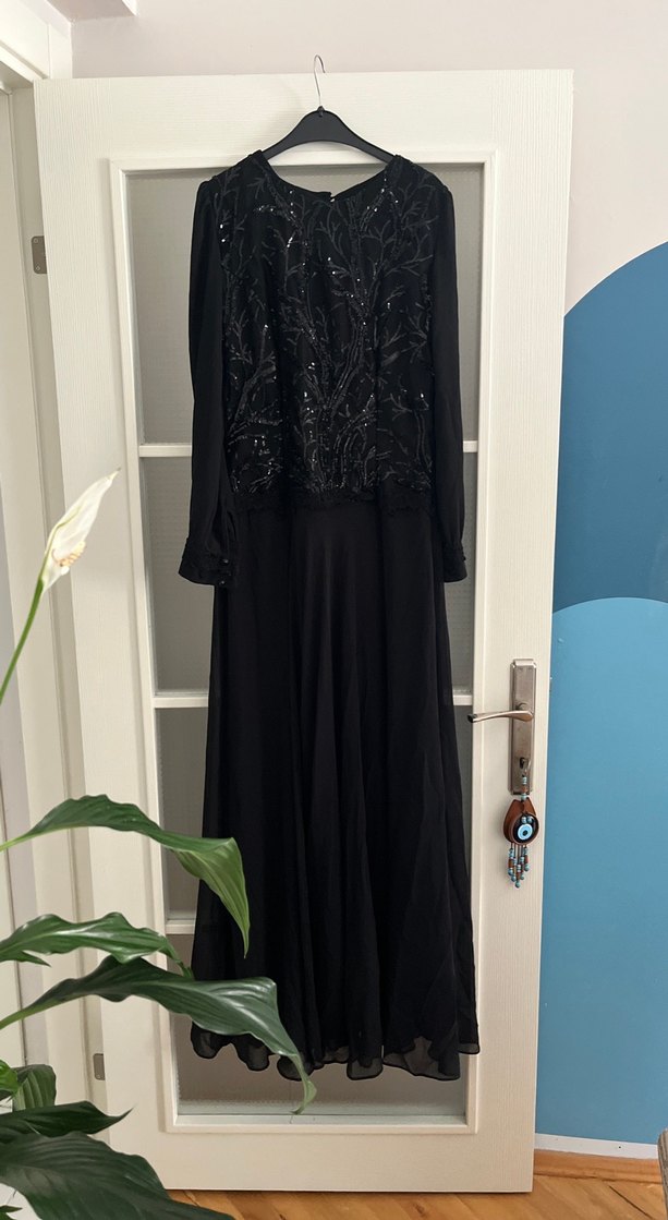 Yüksek yakalı, uzun kollu, bol kesim siyah abiye elbise. Nakışlı detayları ve drapeliyle tarzda düğünler için uygun.