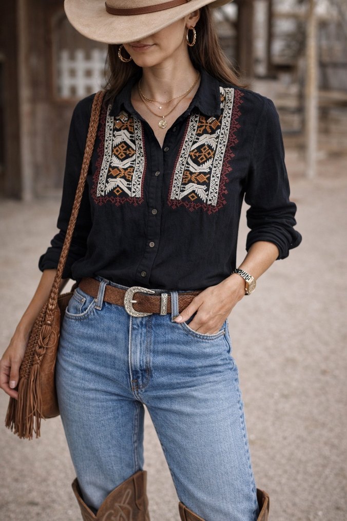 Nakışlı Siyah Uzun Kollu Bohem Gömlek