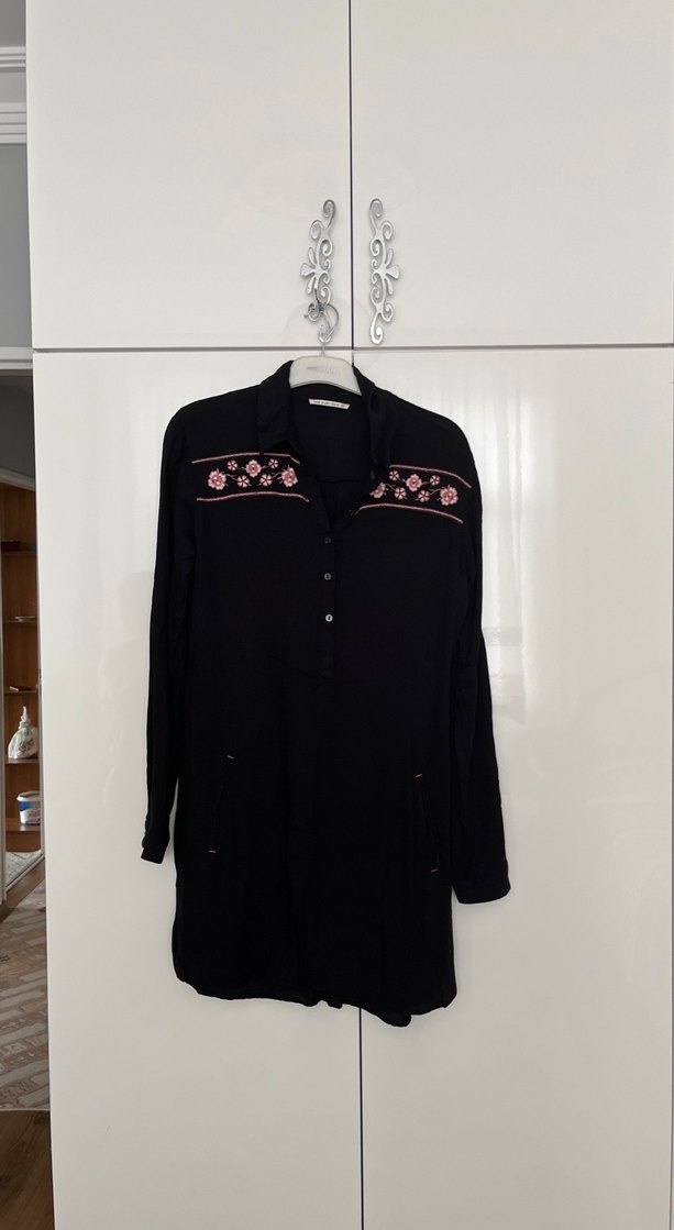 Siyah uzun kollu, yakalı ve düğmeli gömlek. Göğüs kısmında nakışlı çiçek detayları bulunur. Bohem ve minimal tarzı günlük kullanım için birleştirir. Beden xlfakat kalıbı küçük