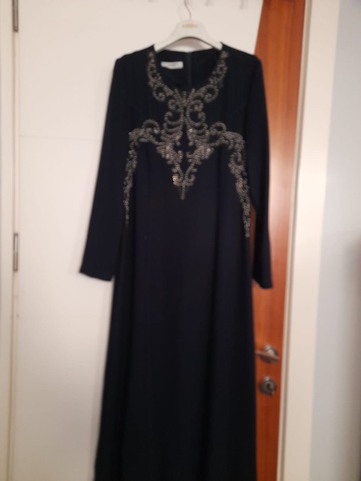 Nakışlı ve drapeli tasarıma sahip siyah uzun kollu, bol kesim abiye elbisedir. Yuvarlak yaka ve gotik tarzda, düğünler için uygundur.