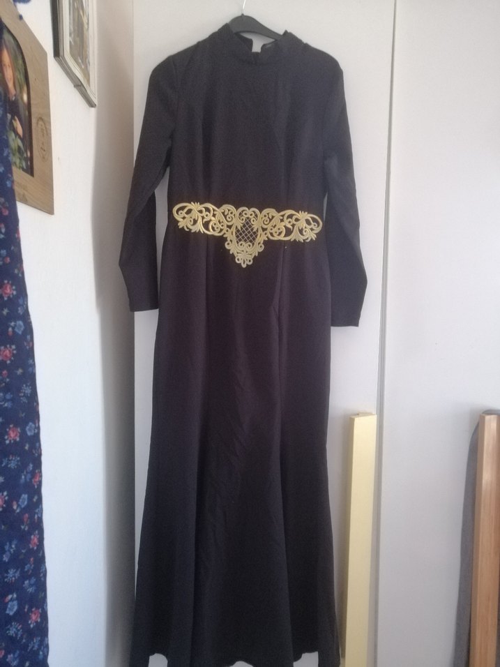 Siyah, uzun kollu ve tekne yaka olan bu dar kesim elbise, ipeksi kumaştan ve nakışlı kemer detaylıdır. Düğün için uygundur. 1 defa dügün için giyildi