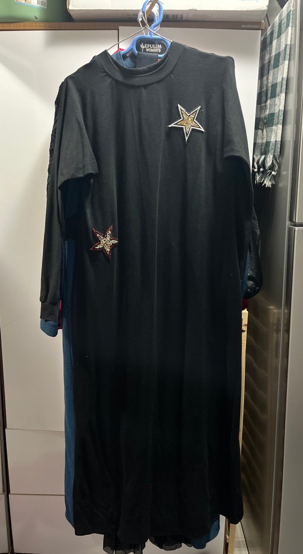 Siyah uzun kollu elbise, yüksek yakalı ve nakışlı yıldız desenlidir. Sentetik kumaştan, bol kesim ve drapeli, günlük modest kullanım için uygundur.