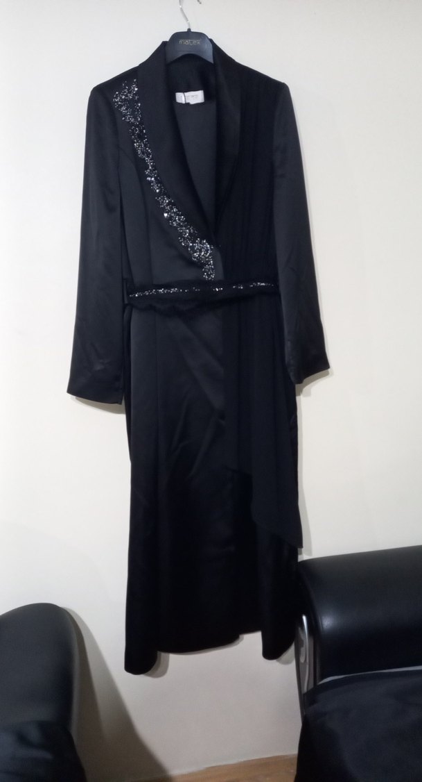 Nakışlı detaylara sahip uzun siyah kadın elbisesi, uzun kollu ve regular fit kesimlidir. Gotik tarzda, koyu renkli bir görünüme sahiptir. Armine mağazasından defosu bulunamadı bluz ve pantolon fiyata dahildir