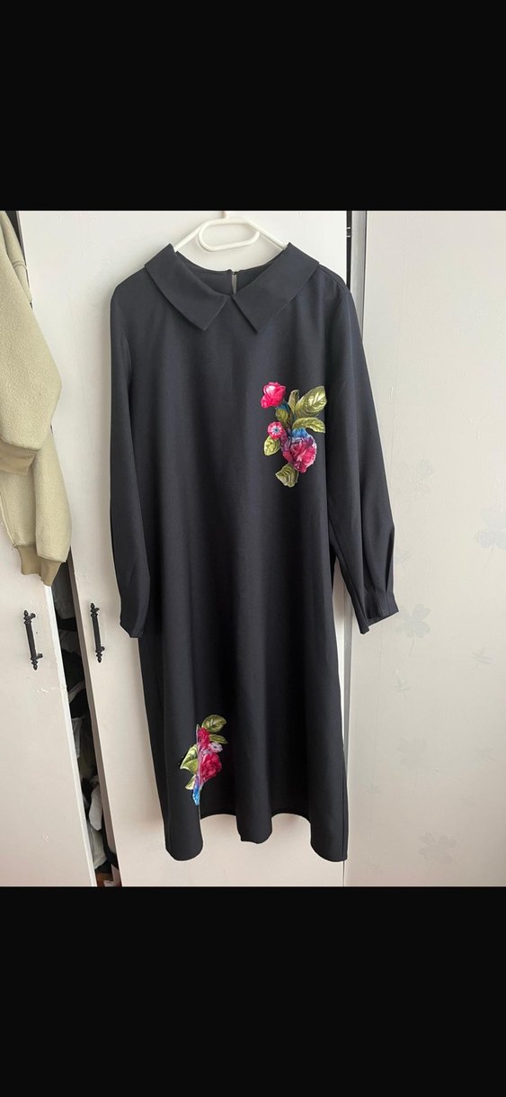 Siyah uzun kollu, bol kesim kadın elbisesi, sentetik kumaştan üretilmiştir. Renkli çiçek nakışları ve düğme detaylarıyla günlük kullanıma uygundur. El dikimi tasarım elbise