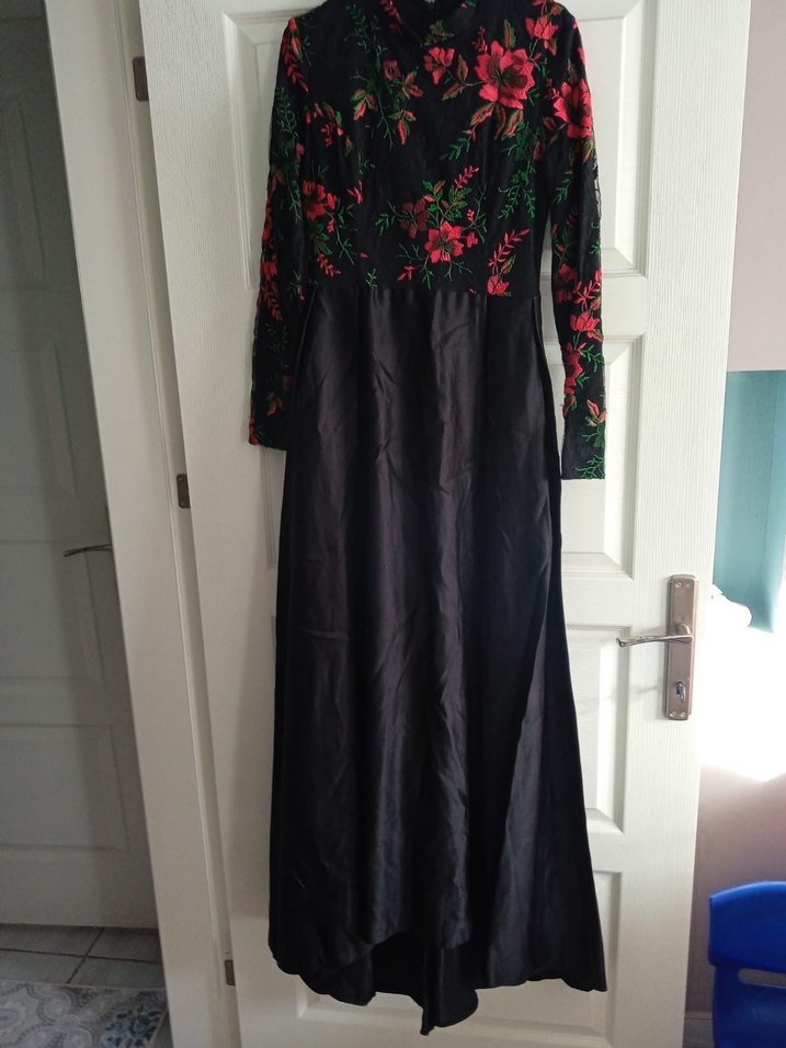 38 40 42 beden uyumludur uzun kollu siyah elbise, nakışlı çiçek desenli üst kısmı ile bol kesim