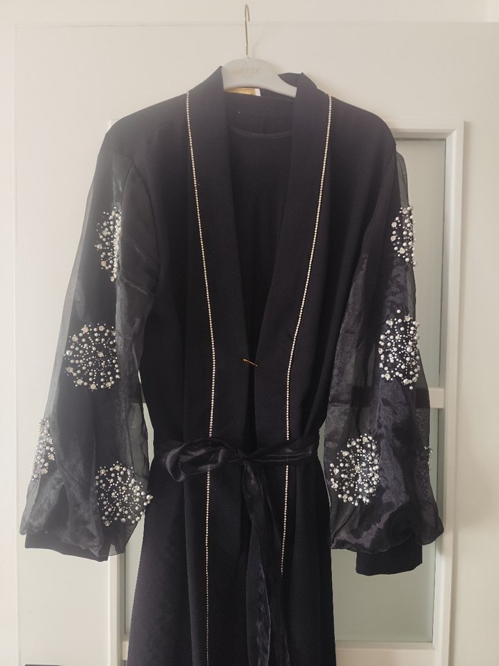 Nakışlı detaylı uzun kollu, kuşaklı siyah elbise. İpek gibi kumaştan, klasik ve minimal tarz için uygun.