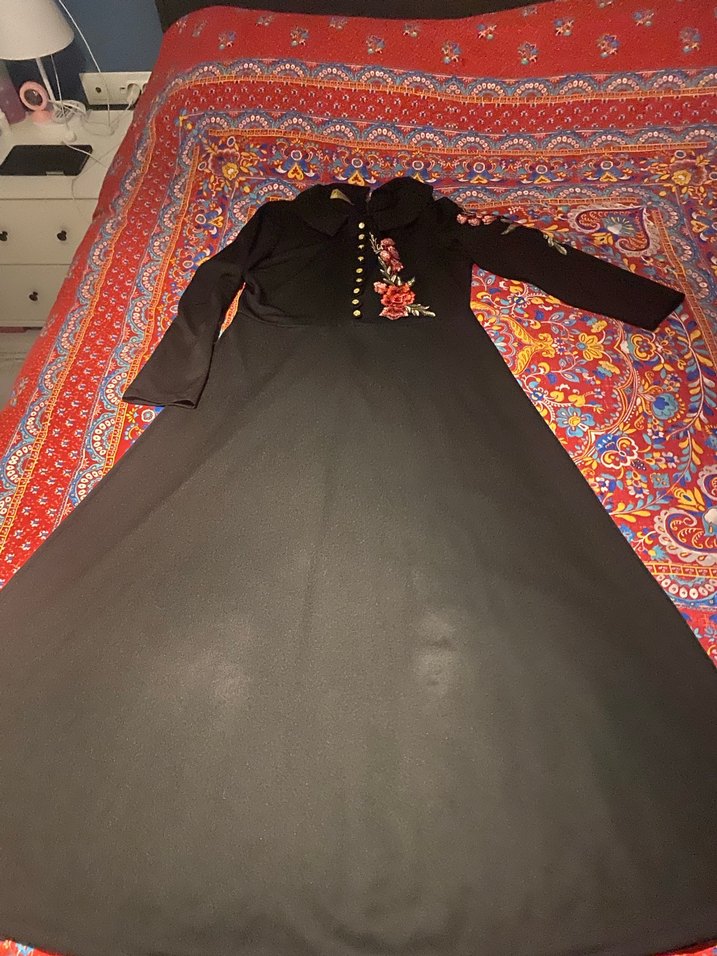 Siyah uzun kollu elbise, yakası kesimli ve nakışlı detaylara sahip. Regular kesim ve drapeli kumaşı ile düğünler için uygun, mütevazı tarzda.