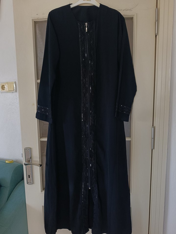 Siyah uzun kollu, nakış detaylı, regular fit kadın elbise. Ön fermuarlı, sentetik kumaştan, günlük kullanım için uygun gotik tarzda. ferace 135 37 arası