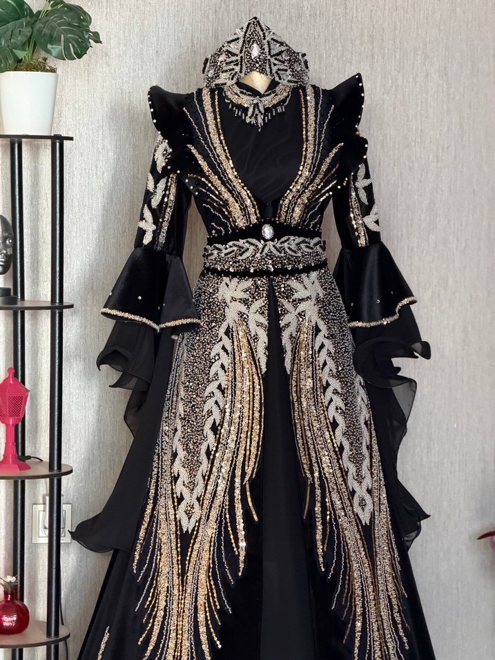 Siyah renkte, uzun kollu, V yakalı kadın kına elbisesi. Nakışlı desenlerle süslenmiş, drapeli ve klasik gotik şıklıkta, düzenli kesim, düğünler için uygun.