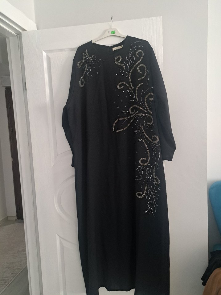 Nakış işlemeli, V yakalı, uzun kollu, salaş kesim siyah uzun elbise, düğün kullanıma uygundur. 58 beden kalibi dardir