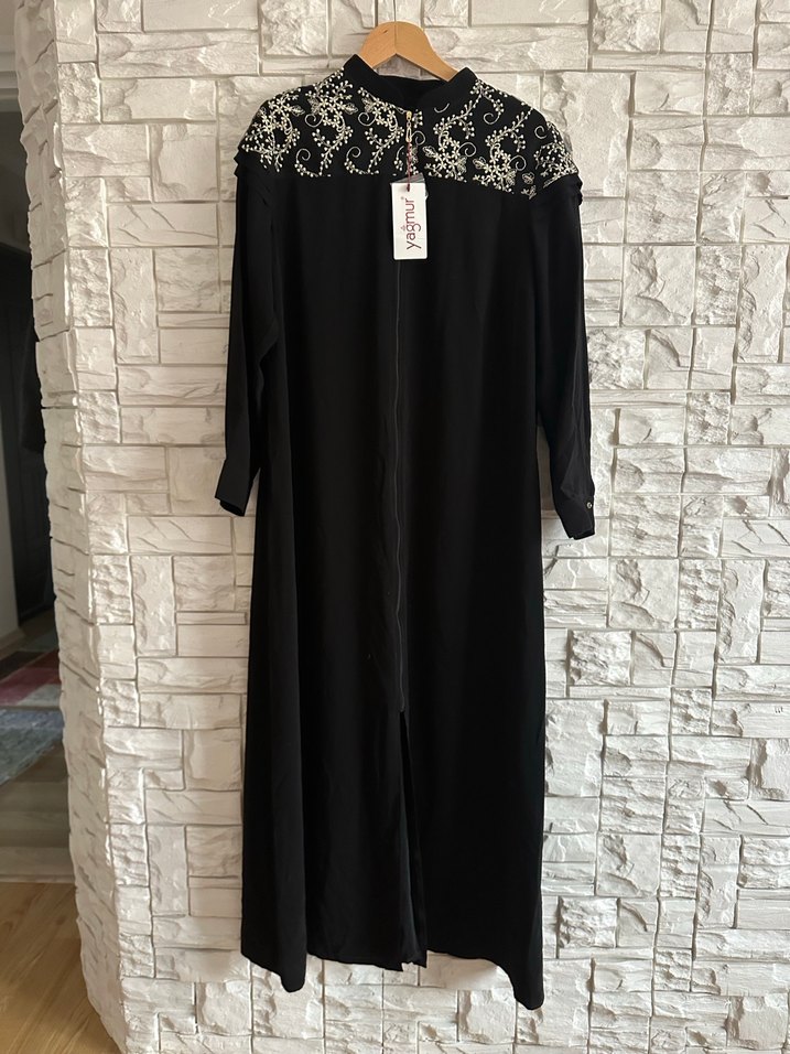 Yüksek yakalı, uzun kollu siyah elbise, üst kısmında nakış detayları bulunur. Vatkalı. Hiç giyilmedi