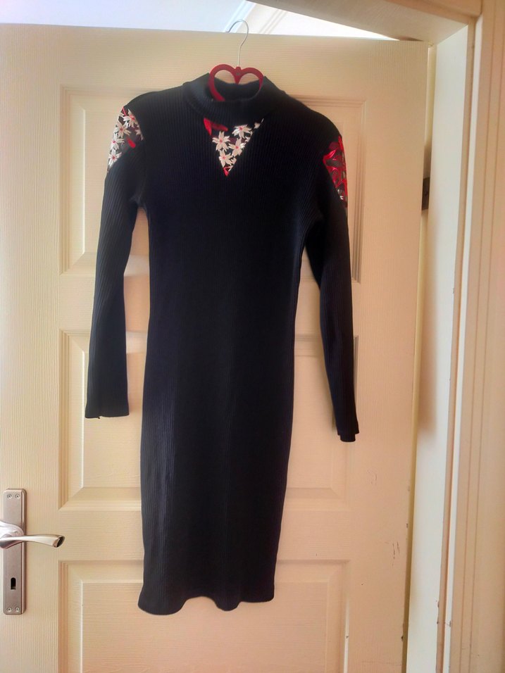 Dar kesim siyah triko elbise, uzun kollu ve V yaka, nakışlı desenlerle süslenmiş, romantik akşamlar için ideal. tül detaylı