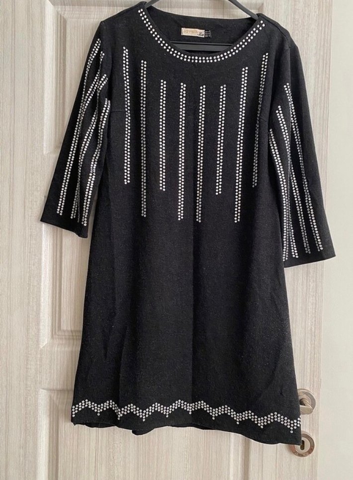 Siyah triko elbise, uzun kollu ve yuvarlak yakalıdır. Gri nakış desenleriyle süslenmiş, bol kesim ve rahat bir bohem tarz sunar.