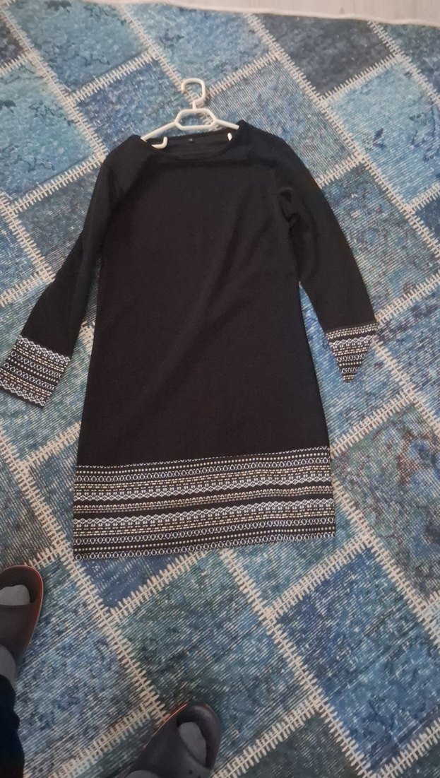 Siyah uzun kollu triko tunik, kayık yaka ve manşet ile etek ucunda nakış detaylarına sahiptir. Rahat kesim ve konforlu dokusu ile gündelik kullanıma uygundur.