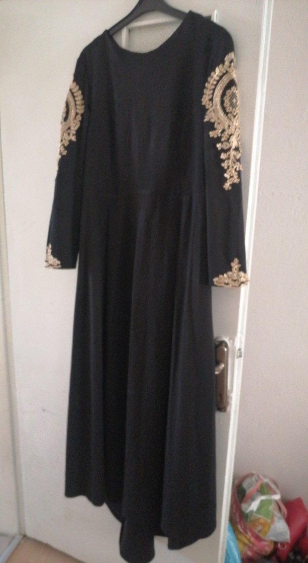 Saten dokulu, oturan kesim siyah uzun elbise, uzun kollarda nakış detayları ve yakasında kesik yaka bulunur. Düğün için uygundur.