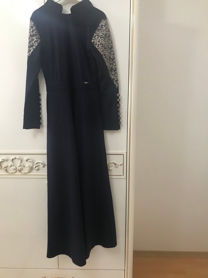 Bu siyah uzun elbise, yüksek yakalı ve kol detaylarında nakışlı uzun kolludur. Kemerli ve normal kesimdir, ofis ve gotik tarz için uygundur. Ikı koltuk arası 40 boy 142