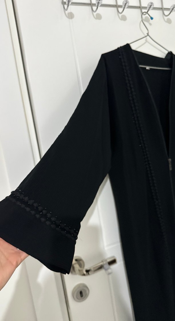 Siyah uzun kollu, nakış detaylı uzun elbise. Notlu yaka ve fermuarlı ön kısmı vardır. Yumuşak krinkıl görünümlü kumaştan, günlük kullanıma uygun modest ve spor tarzda. Suudi Arabistandan hediye gelmiştir hiç kullanılmadı.