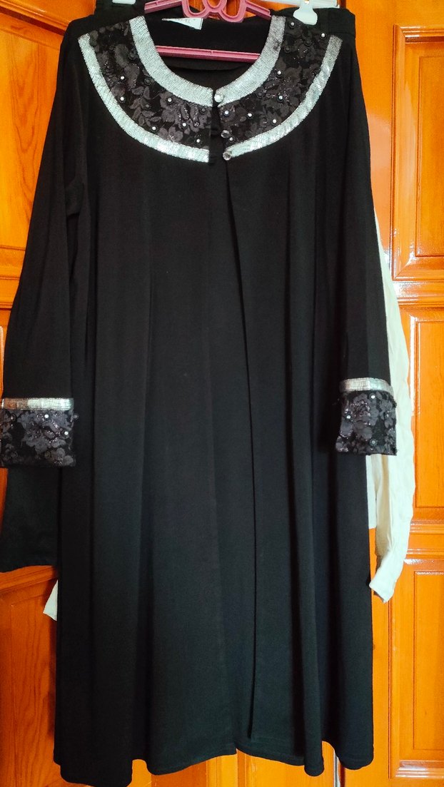 Siyah uzun kollu, yüksek yakalı ve nakış detaylı uzun ferace. Rahat ve dökümlü kesimiyle, yumuşak sentetik kumaştan üretilmiştir.
