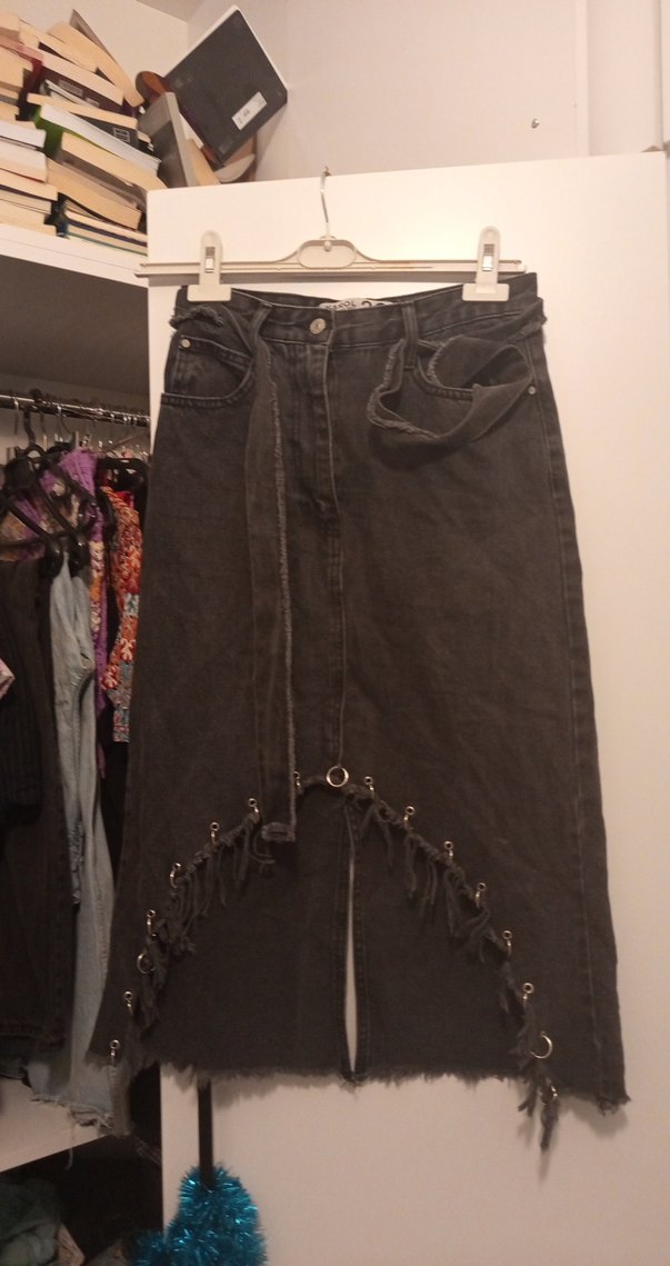 Nakışlı detaylara ve kemerli bele sahip siyah uzun kot etek, Günlük kullanıma uygundur. güzel bir etek çok kullanmadım, kolayca dikilebilecek bir yırtık bulunuyor o kadar